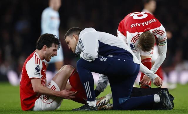 就目前的消息来看,尚不确定两名新伤号将要休战多久。其中莫斯克拉的情况似乎要更严重一点,他在争顶落地时感到不适,可能伤到了脚踝或者膝盖,具体情况还要看进一步的检查结果。而赖斯则在倒地时摸着自己的小腿,又是肌肉伤势。这种伤病可轻可重,阿尔特塔赛后的说法是“他能走路但不能踢球”,而“网络会诊”的讨论结果还比较乐观。有伤病专家通过目测做出初步诊断:赖斯可能是比目鱼肌轻微拉伤或者紧绷,这类问题通常可以迅速恢复,休养期不会超过两周。甚至还有可能,赖斯的下场更多是出于“预防和保护”。